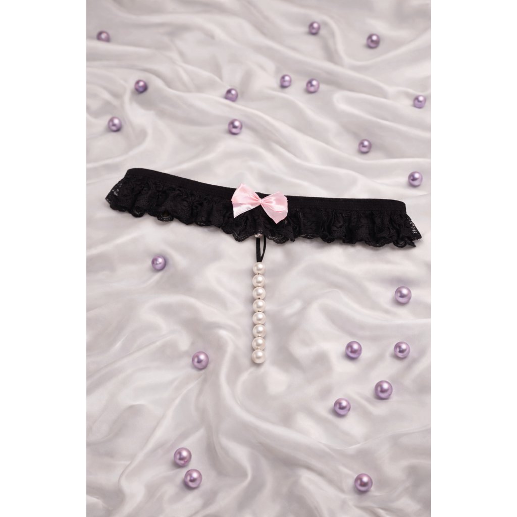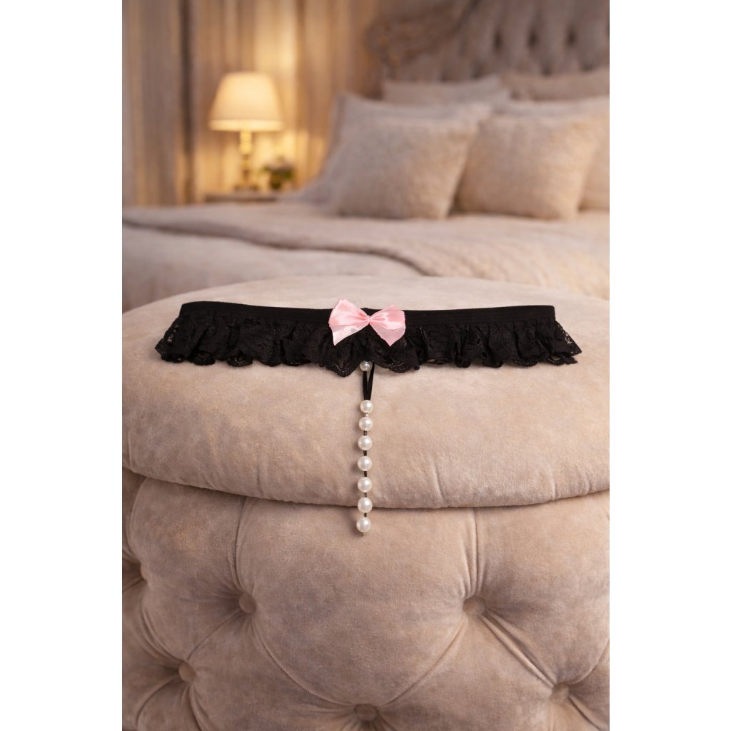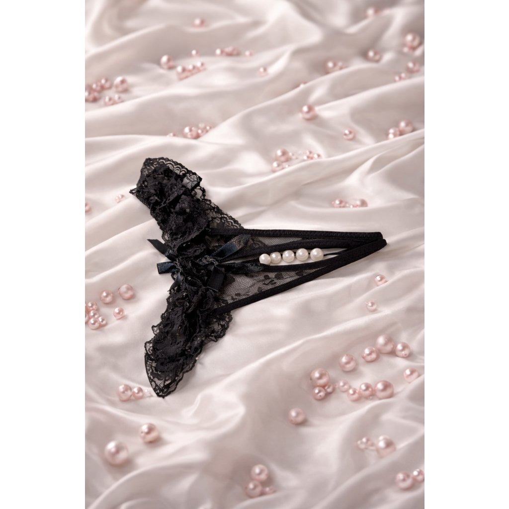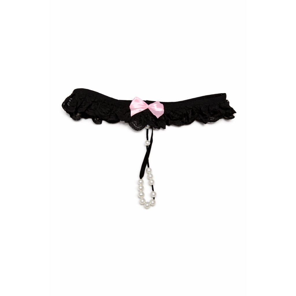 Čierne čipkované tanga nohavičky s perlami na intímnych partiách.